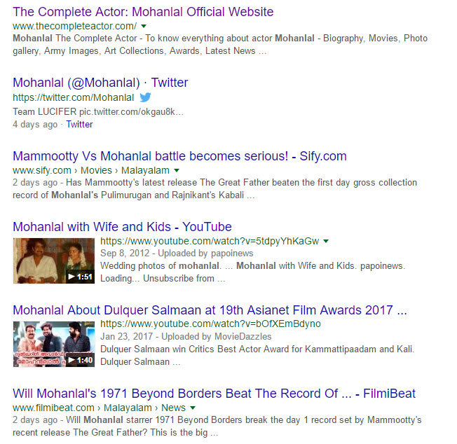 If you want to eliminate search results with a particular word, you can use minus sign. For example, if you search for “Mohanlal -songs”, you will view the results which are not related to songs in the Mohanlal films.