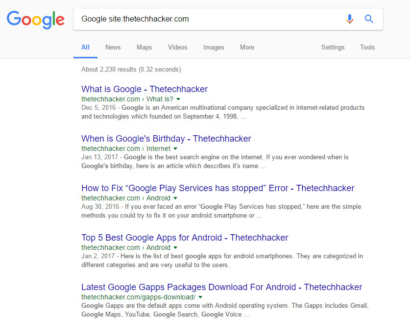 If you provide the relevant website address on the search, Google will display results only with the website name. Try searching for Google site:thetechhacker.com and check out the result