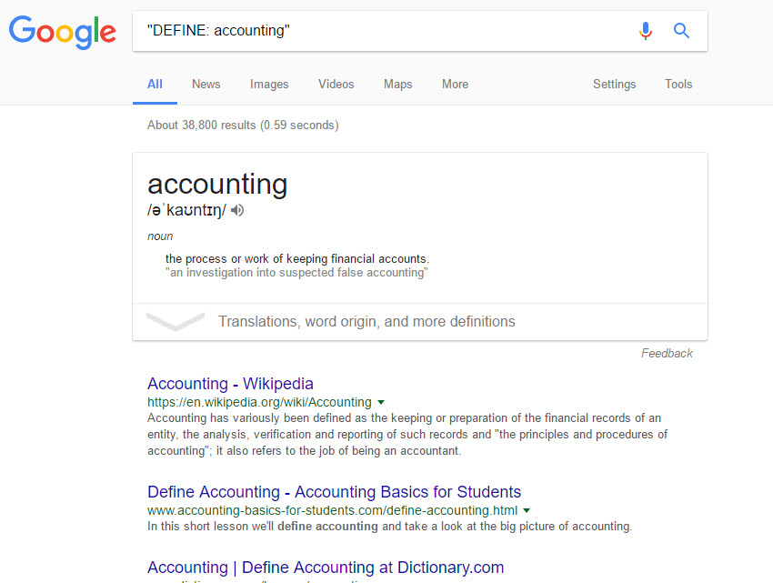 If you want to learn the meaning of a particular keyword, you can use DEFINE: with the term. Try using “DEFINE: accounting” and find out the result. You can find out the meaning of any term using DEFINE.