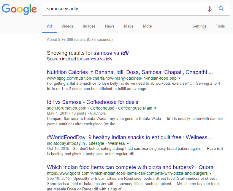 Do you want idly or samosa for your breakfast? You can compare both of them by searching with “vs.” between both keywords.