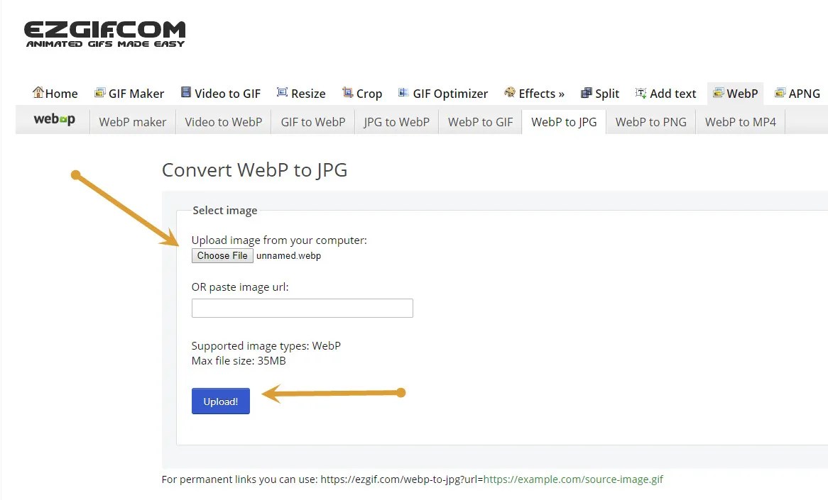 - Visit ezgif website and upload the WEBP file you want to convert.